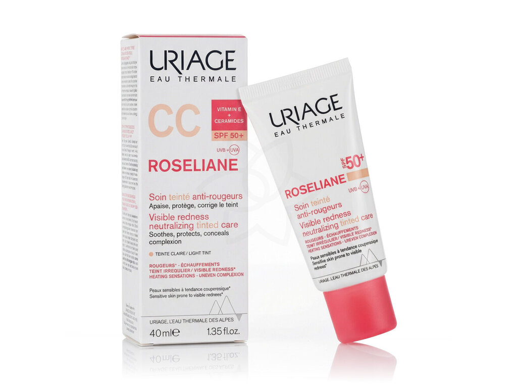 Uriage Roséliane CC Cream SPF 50+ (Light Tint) 40 ml je multifunkční zázrak, speciálně navržený pro citlivou pleť, která má sklony k zarudnutí a kuperóze. Tento krém kombinuje přednosti vysoké sluneční ochrany SPF 50+, přirozenou korekci tónu pleti a intenzivní zklidňující péči. Obsahuje termální vodu Uriage, kterou obohacují ginsenosidy a patentovaný komplex TLR2-Regul. Tyto ingredience se snaží snížit podráždění a zarudnutí pleti, čímž posilují její přirozenou kožní bariéru.
