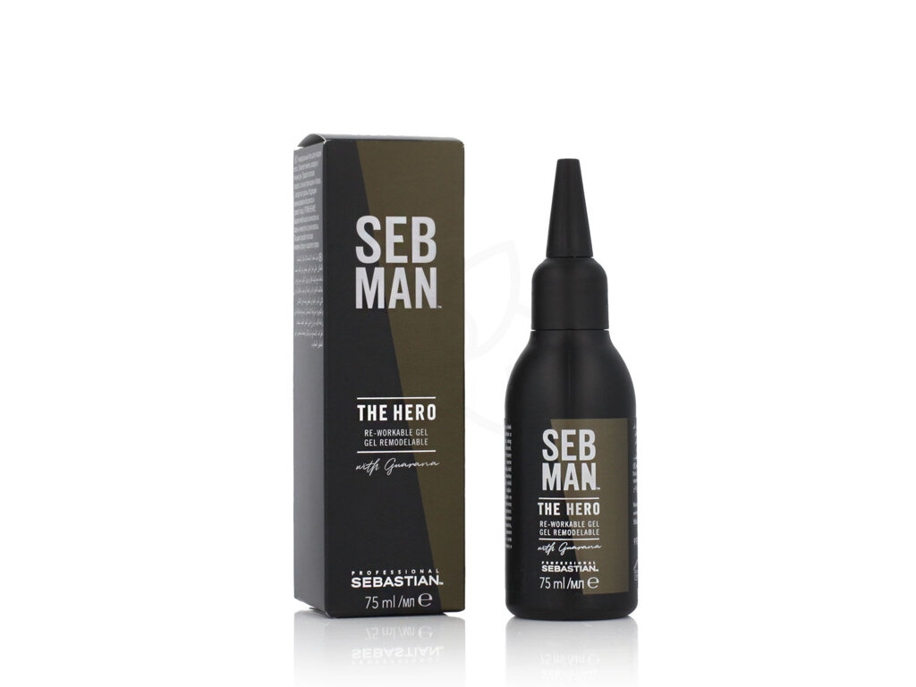 Sebastian Professional Seb Man The Hero Re-Workable Gel 75 ml – flexibilní gel, který poskytuje pevnou fixaci a lesklý hladký finiš s možností úpravy účesu během dne. Obsahuje výtažky z guarany a růžového pepře, které vlasům dodávají přirozený lesk, a osvěžující vůni bergamotu.
