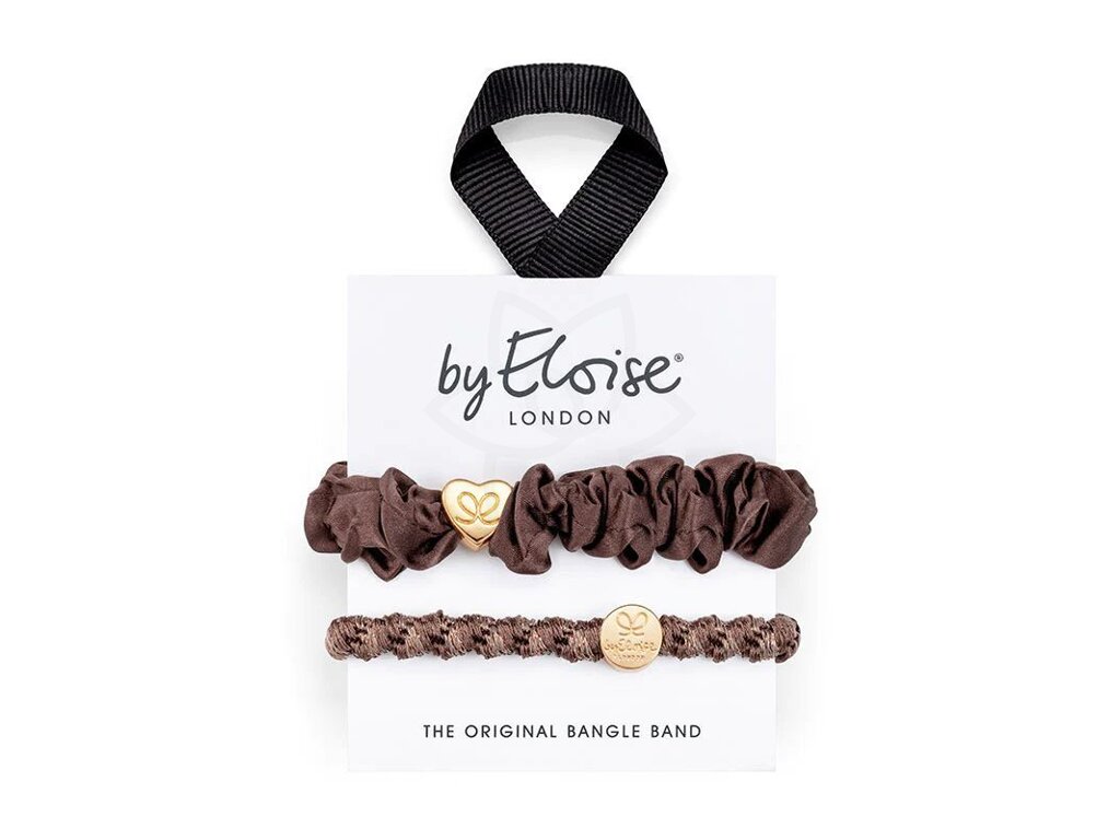 By Eloise London Miss Mocha Set je elegantní sada dvou luxusních gumiček, které přinášejí spojení praktičnosti a stylu. Tyto gumičky jsou vyrobeny z kvalitního elastického materiálu, který pevně drží účes po celý den, aniž by způsoboval tahání nebo lámání vlasů. Každá gumička je navíc ozdobena jemným zlatým přívěskem, který dodává vlasovému doplňku šmrnc elegance a sofistikovanosti.