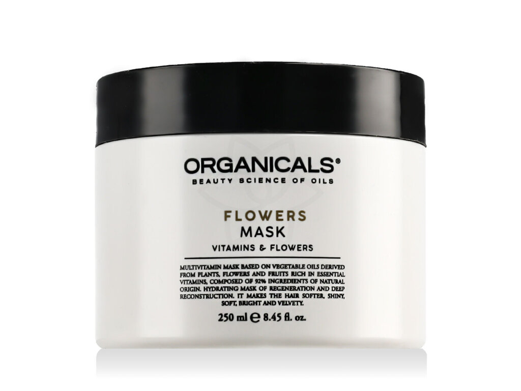 Organicals® FLOWERS Mask je luxusní květinová regenerační maska na vlasy o objemu 250 ml, která přináší intenzivní výživu pro suché, poškozené nebo barvené vlasy. Hlavními složkami jsou pečlivě vybrané přírodní oleje a rostlinné extrakty, které pronikají hluboko do vlasového vlákna a zajišťují hydrataci, posílení a obnovení vitality. Prolnutí květinových tónů dodává vlasům jemnou a osvěžující vůni, která se stává příjemným zážitkem při každém použití.