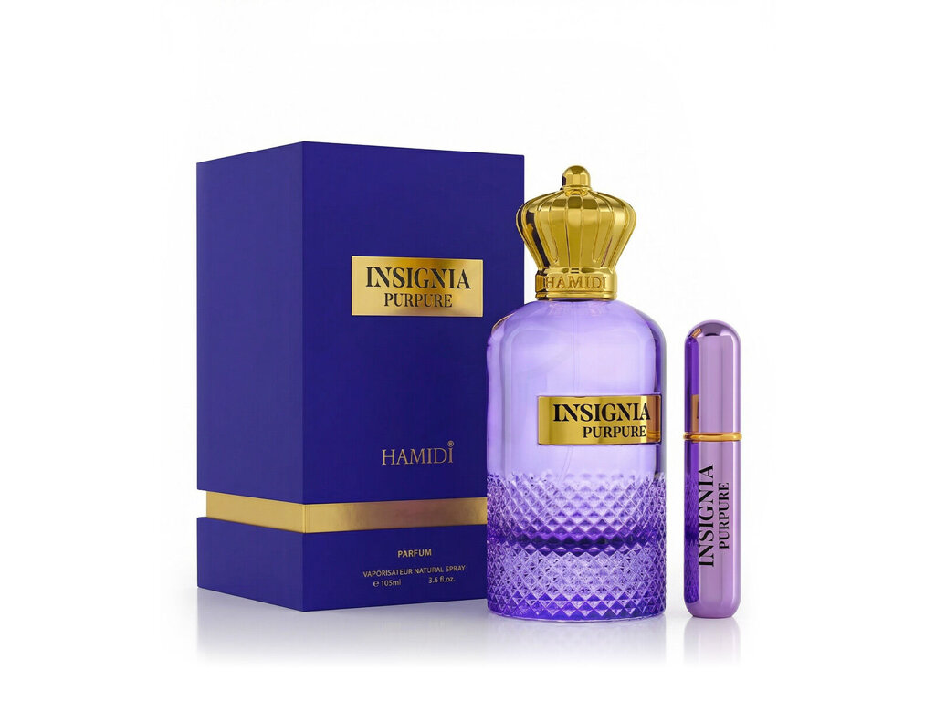 Insignia Purpure od Hamidi je elegantní a hřejivý parfém z roku 2023, navržený pro unisexové milovníky výrazných, avšak harmonických vůní. Otevírá se jiskřivou kombinací svěžího pomeranče, který vnáší šťavnatou energii, a pikantního zázvoru, jenž parfému dodává okamžitou vitalitu a příjemný nádech ostrosti. Tento úvod je živý a povzbudivý, evokující pocit teplého vánku, jenž předchází bouři – ideální pro odvážné duše, které chtějí zanechat dojem.