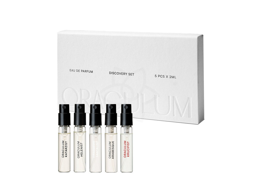Objevte překvapení, které skrývá exkluzivní poznávací sada Oraculum Discovery Set, která přináší fascinující vhled do umění této výjimečné značky. Sada obsahuje pět ohromujících parfémových vod (EDP) o objemu 2 ml, které zachycují pestrou paletu vůní a stylů. Mezi nimi najdete KATARZIST, s její intenzivní a mystickou kompozicí, HELENIST, evokující elegance antických múz s klasickými tóny, a hřejivý SANTALIST, vystavěný na santalovém dřevu a jemných kořeněných nuancích. Dále je zde ARABESQUE, smyslná orientální vůně s exotičtějšími podtóny a nakonec KRUCIFIST, temná dřevitá vůně s duchovní hloubkou a nepopiratelným charakterem.