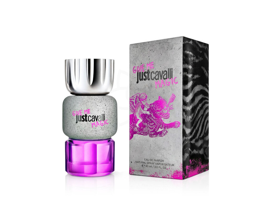 Roberto Cavalli Just Cavalli Give Me Magic for Her je okouzlující orientálně-dřevitá vůně pro ženy, která byla uvedena na trh v roce 2025. V její kompozici se snoubí osvěžující pomeranč s hřejivým muškátovým oříškem a delikátním jasmínem, jež vytváří úvodní akord plný energie a květinové lehkosti. S každým odstřikem se zároveň odhaluje srdce parfému, jež je umocněno bohatými a exotickými tóny šafránu, kadidla a oudového dřeva. Tyto složky dodávají vůni fascinující hloubku a smyslný orientální charakter, který okouzlí nejen nositele, ale i jeho okolí.